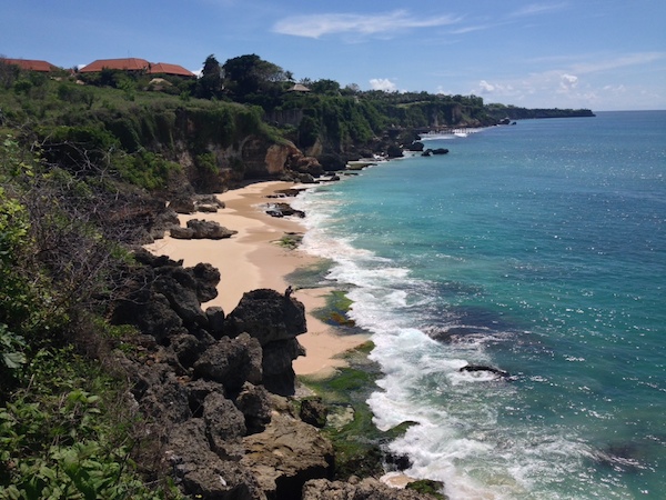 Пляж по дороге из Улувату в Нуса Дуа. Здесь почти нет волн и удобно купаться, на берегу есть кафе и шезлонги. А к самому пляжу ведет очень красивая дорога, вырубленная в скале. На прокат можно взять каное и исследовать океанский риф всей семьей.
