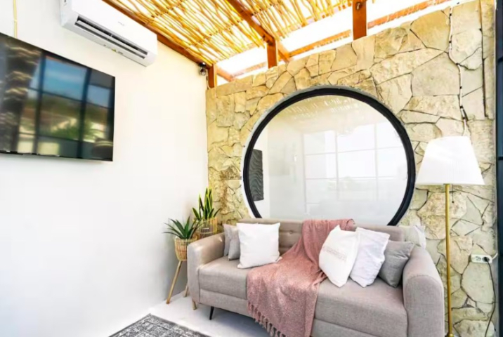 Бассейн с зоной отдыха. Маленькая гостиная с кондиционером, обеденным столом и кухней.