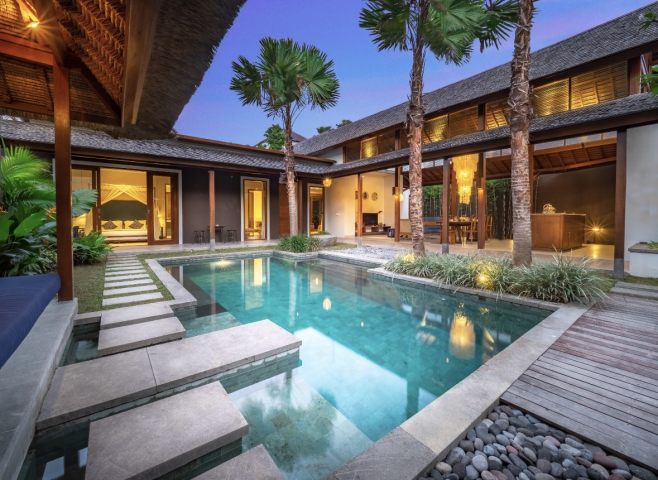 На каждой вилле своя приватная территория с бассейном и шезлонгами для загара.