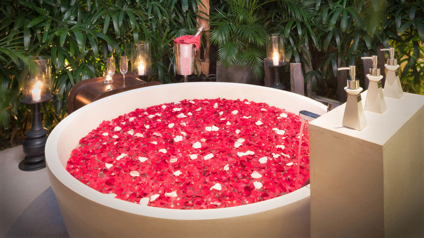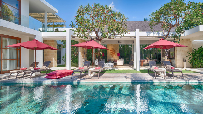 Огромный 21-метровый бассейн окружен прекрасным тропическим садом с газебо для отдыха или массажа.